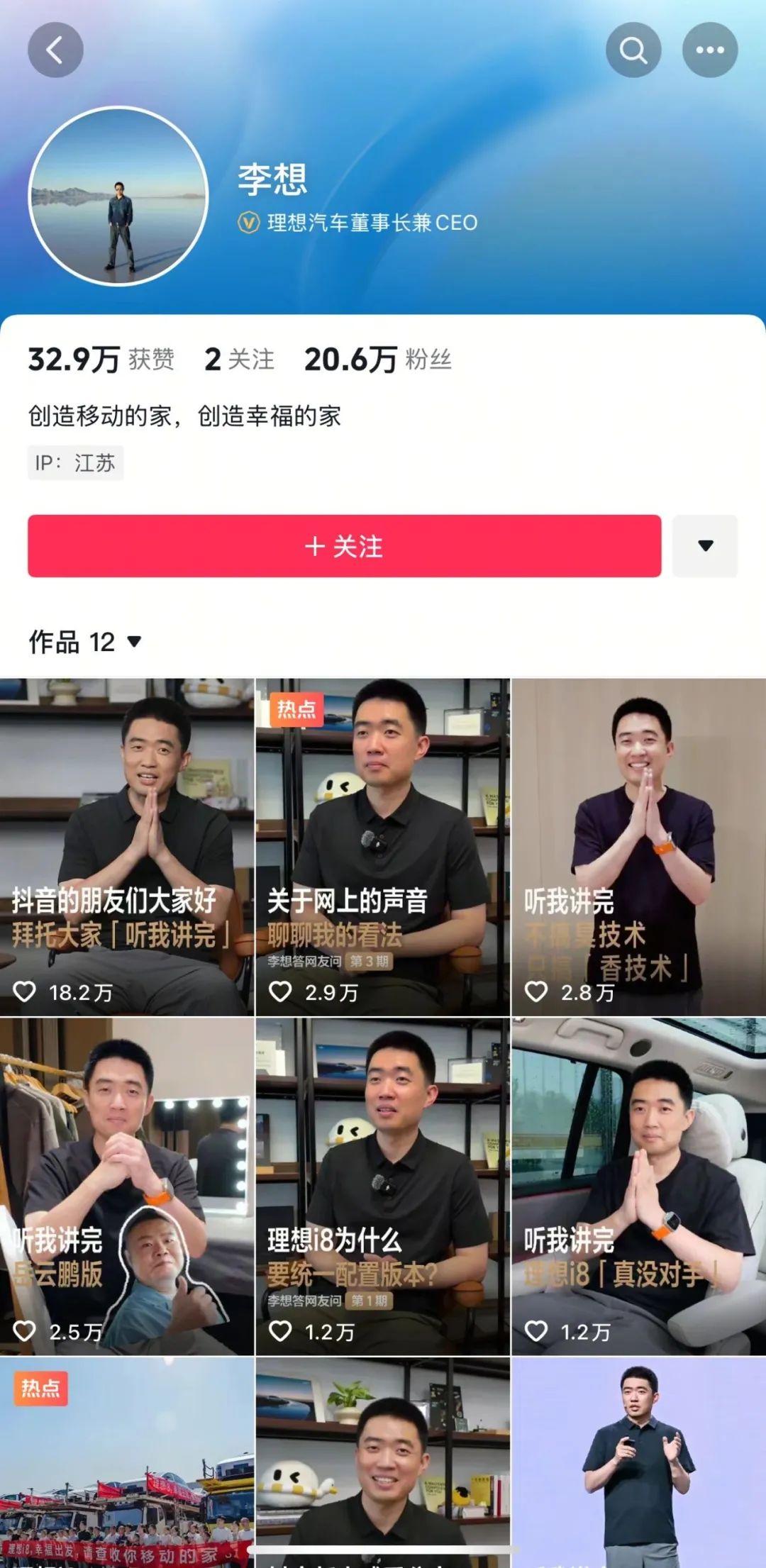 7月29日理想第二款純電車型i8發(fā)布前一周,李想終于在短視頻平臺抖音開通了個人賬號,他玩起了自己早些年的梗,希望網(wǎng)友能“聽他講完”,還說網(wǎng)友玩他的梗他會很開心,他還分享自己的減肥經(jīng)驗,也說會好好學(xué)習(xí)拍短視頻讓出鏡更自然點(diǎn)。
