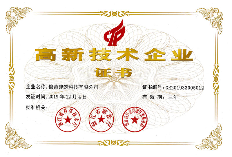 2019年12月,錦蕭建筑科技有限公司成功通過(guò)高新技術(shù)企業(yè)認(rèn)定,并于近日收到由浙江省科學(xué)技術(shù)廳、浙江省財(cái)政廳及國(guó)家稅務(wù)總局浙江省稅務(wù)局頒發(fā)的“高新技術(shù)企業(yè)”證書。