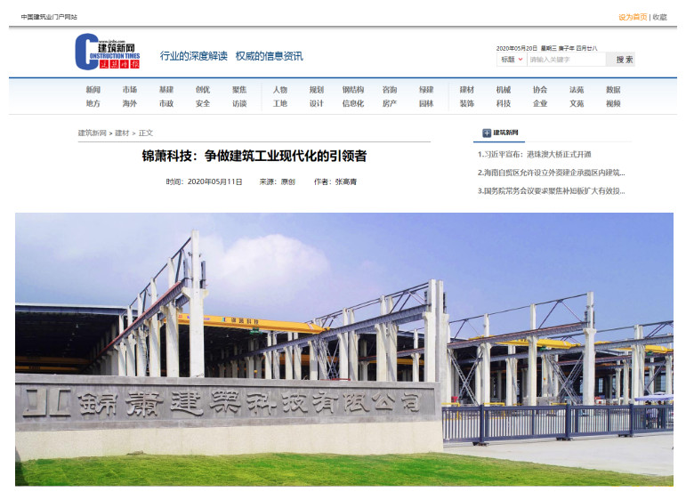 2020年5月18日,《建筑時報》第3724期第5版,刊登了《爭做建筑工業(yè)現(xiàn)代化的引領(lǐng)者——錦蕭建筑科技有限公司走訪記》一文,對錦蕭建筑科技有限公司進行了大篇幅報道。