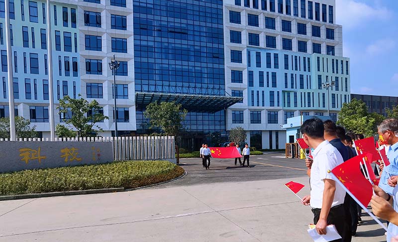 9時(shí)28分,升旗儀式正式開始。在眾人的注目下,四名旗手護(hù)衛(wèi)著國(guó)旗入場(chǎng)。伴隨著激昂的《義勇軍進(jìn)行曲》,鮮艷的五星紅旗冉冉升起。緊接著,在《明天會(huì)更好》的動(dòng)人旋律中,錦蕭科技司旗也緩緩升起。鮮紅的國(guó)旗和錦蕭的司旗在公司生產(chǎn)基地上空迎風(fēng)飄揚(yáng),給員工堅(jiān)定的信念和無(wú)限的力量!