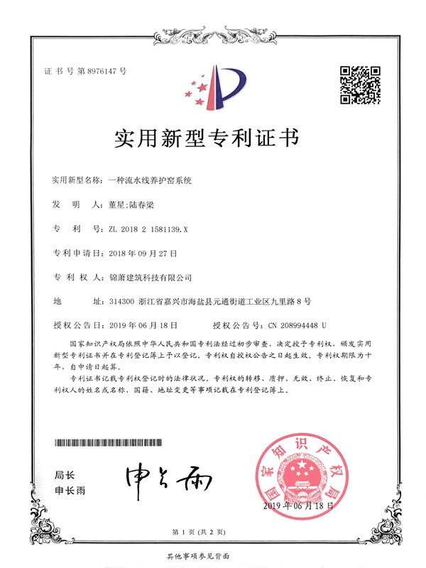 專利證書-一種流水線養(yǎng)護(hù)窯系統(tǒng)