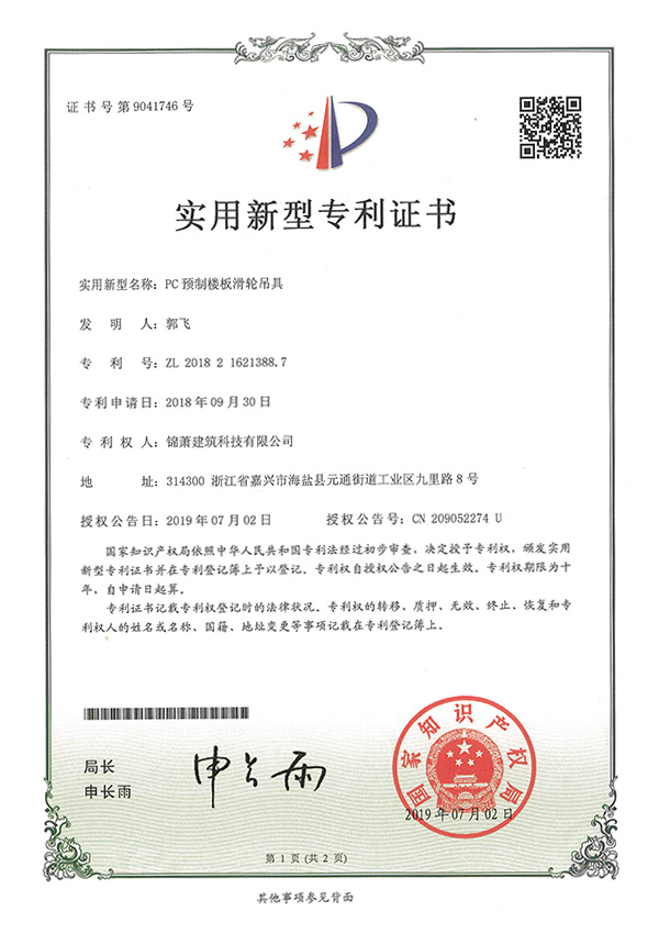 專利證書-PC預(yù)制樓板滑輪吊具