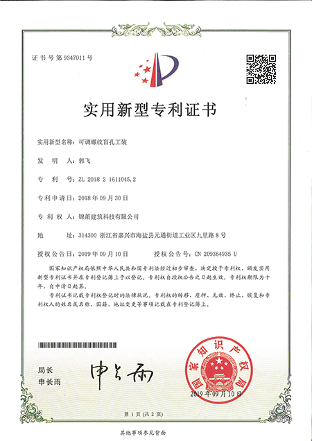 專利證書--可調(diào)螺紋盲孔工裝