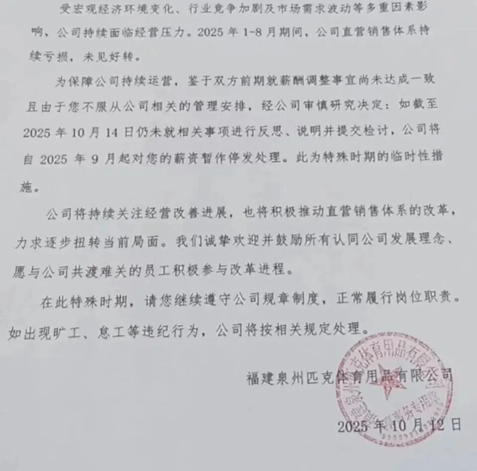 DoNews10月15日消息,日前,有匹克員工透露,公司向拒絕降薪的員工發(fā)出“最后通牒”,要求其在10月14日前提交“反思檢討”,否則將面臨停發(fā)9月份工資的處罰。