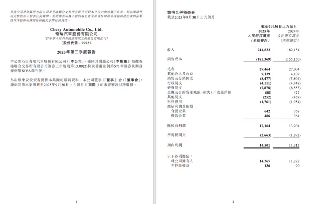 DoNews10月31日消息,今天午間,奇瑞汽車(chē)發(fā)布公告,2025 年前三季度營(yíng)收 2148.33 億元,去年同期為 1821.54 億元;凈利潤(rùn) 143.65 億元,去年同期為 112.22 億元。