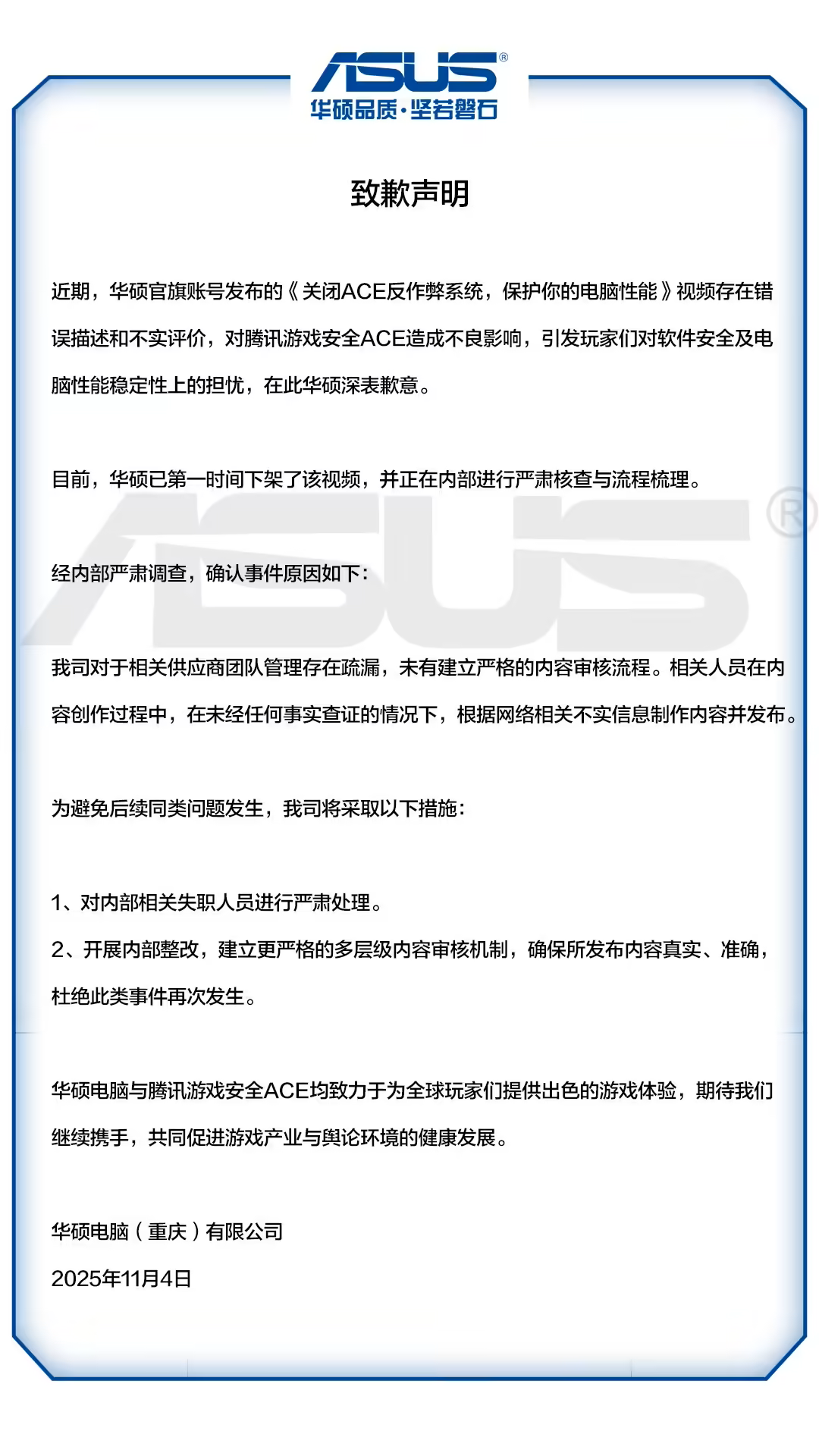 DoNews11月5日消息,華碩電腦(重慶)有限公司 4日發(fā)布致歉聲明,就華碩官旗賬號此前發(fā)布的《關(guān)閉 ACE 反作弊系統(tǒng),保護(hù)你的電腦性能》視頻(涉事視頻目前已下架)對騰訊游戲 ACE 和玩家群體表示歉意。