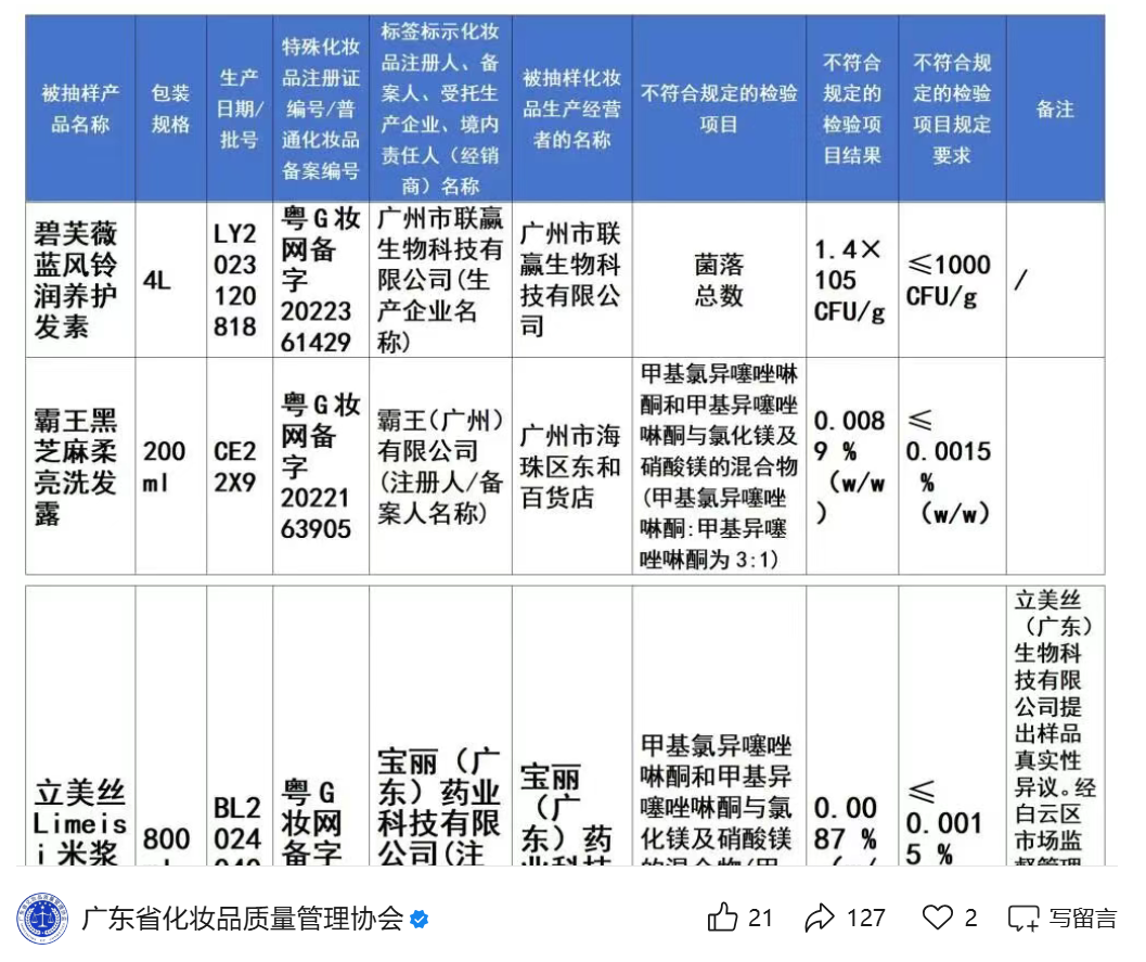在洗護(hù)發(fā)類不合格產(chǎn)品中,出現(xiàn)了昔日國貨洗護(hù)TOP品牌霸王。具體來看,此次不合格產(chǎn)品系霸王黑芝麻柔亮洗發(fā)露,據(jù)廣州市監(jiān)局發(fā)布的通告顯示,因甲基氯異噻唑啉酮和甲基異噻唑啉酮與氯化鎂及硝酸鎂的混合物(甲基氯異噻唑啉酮:甲基異噻唑啉酮為3:1)添加量超標(biāo)被通報。