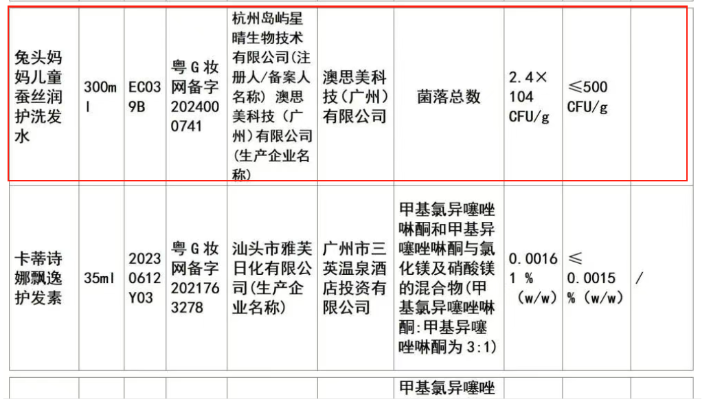 除霸王外,在洗護(hù)發(fā)領(lǐng)域被檢出不合格的產(chǎn)品中,還涉及了兒童化妝品牌兔頭媽媽旗下產(chǎn)品。據(jù)廣州市監(jiān)局發(fā)布的通告顯示,兔頭媽媽兒童蠶絲潤護(hù)洗發(fā)水因菌落總數(shù)超標(biāo)被判不合格。其檢測值為2.4×10? CFU/g,遠(yuǎn)超《化妝品安全技術(shù)規(guī)范》規(guī)定的≤500 CFU/g的限值要求。 ?