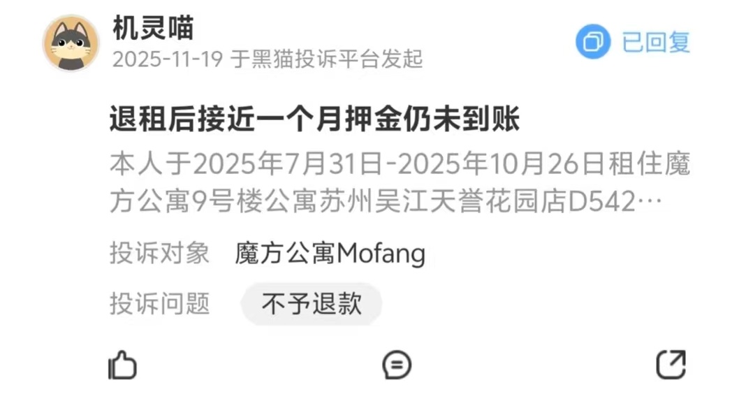 在黑馬投訴平臺,近幾個月有不少網(wǎng)友都曾發(fā)帖呼吁“避雷”魔方公寓。有網(wǎng)友表示,自己本來以為魔方公寓價格不貴,是連鎖比較靠譜。但沒想到最后押金遲遲不退。