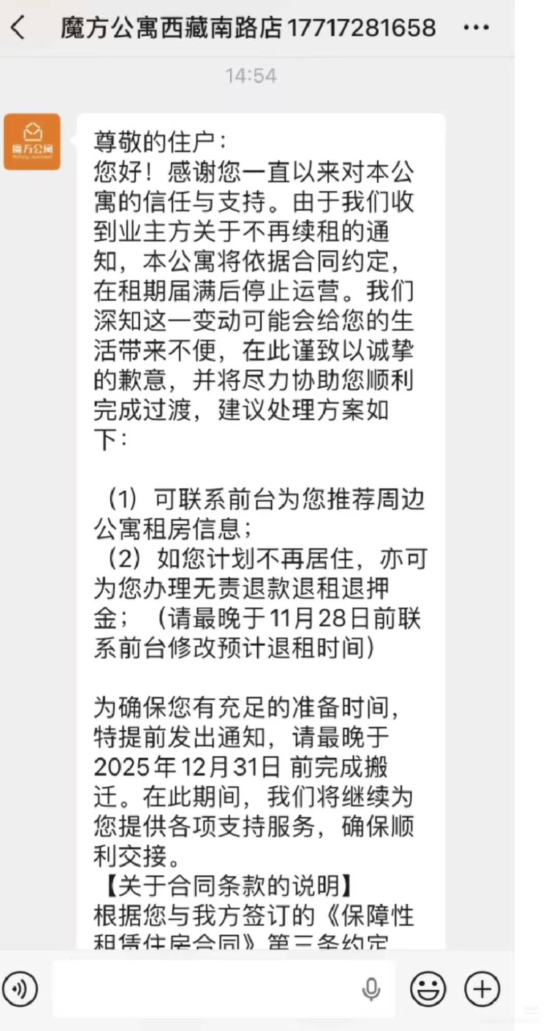 DoNews11月26日消息,11月24日,有網(wǎng)友在社交平臺發(fā)帖稱上海魔方公寓疑似爆雷,強制退租且沒有違約金。據(jù)該網(wǎng)友曬出的截圖顯示,名稱為“西藏南路店”的群聊中,相關(guān)人員發(fā)布通知稱,因收到業(yè)主方不再續(xù)租通知,將在租期屆滿后停止運營。
