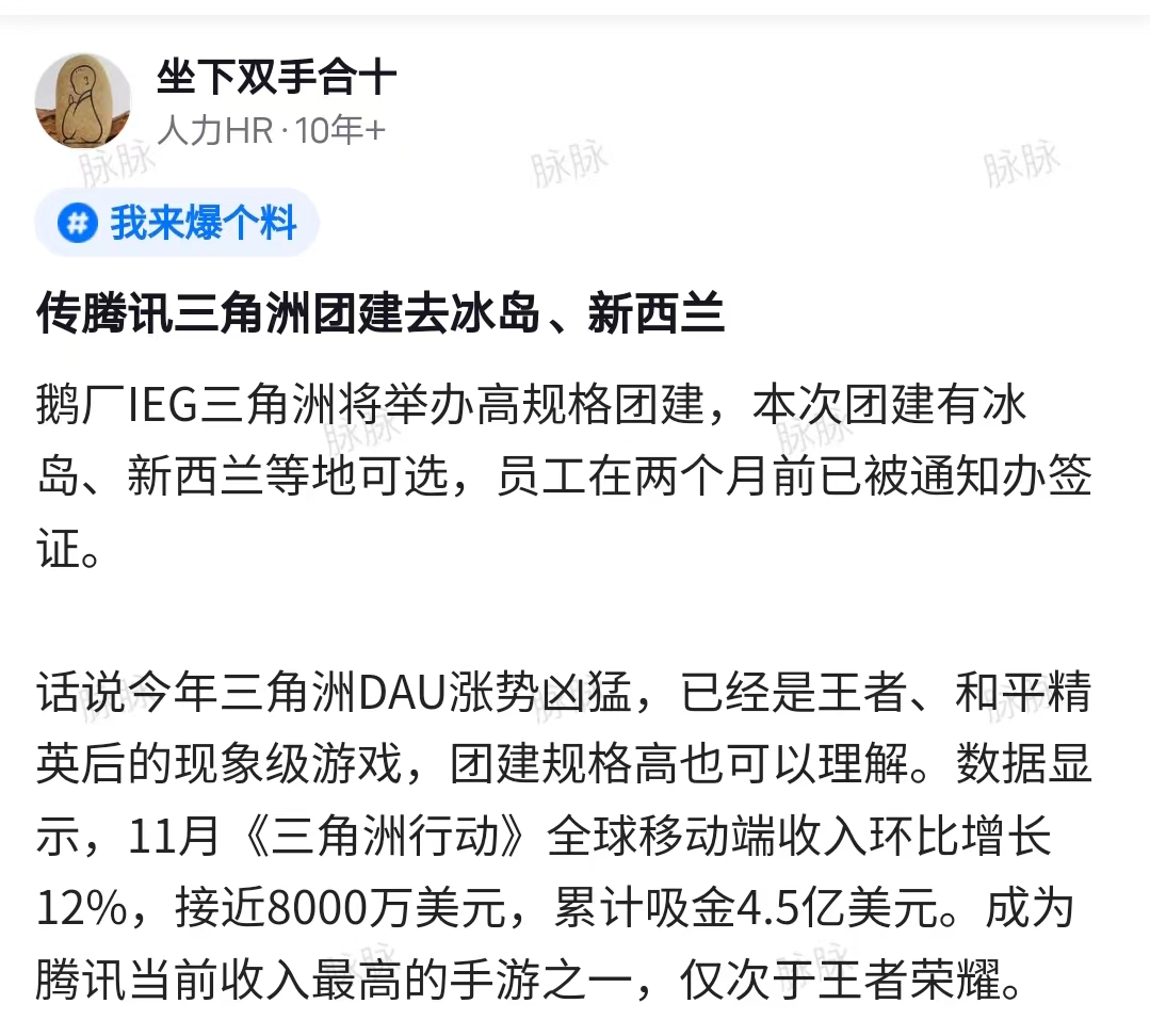 據(jù)職場(chǎng)社交平臺(tái)脈脈消息,騰訊互動(dòng)娛樂(lè)事業(yè)群(IEG)旗下現(xiàn)象級(jí)手游《三角洲行動(dòng)》團(tuán)隊(duì)近日啟動(dòng)高規(guī)格海外團(tuán)建,目的地包括冰島、新西蘭等國(guó)家,員工已提前兩個(gè)月接到簽證辦理通知。