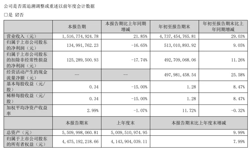 今年三季度公司營(yíng)收15.17億,同比增長(zhǎng)21.85%;歸母凈利潤(rùn)1.35億,同比下滑16.65%,利潤(rùn)縮水可謂相當(dāng)明顯。