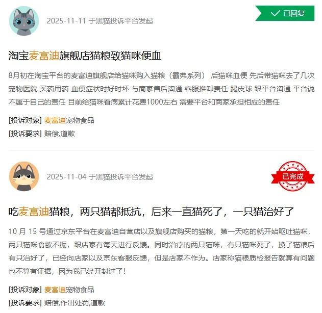 不過(guò)除了在營(yíng)銷端的持續(xù)投入外,圍繞在乖寶寵物身邊的質(zhì)疑聲也多次出現(xiàn)。社媒平臺(tái)上有消費(fèi)者表示,自己家里養(yǎng)了三年的寵物貓?jiān)诔粤他湼坏县埣Z后沒(méi)幾天突然離世、狗糧開封后有明顯異味…黑貓投訴平臺(tái)上針對(duì)麥富迪的投訴量也有750條,其中有不少集中在食品安全問(wèn)題上。