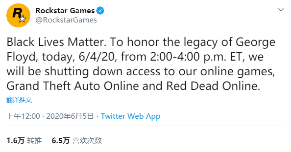 為響應(yīng)美國(guó)國(guó)內(nèi)局勢(shì)紀(jì)念喬治·弗洛伊德,R星在昨晚2點(diǎn)-4點(diǎn)關(guān)閉了《GTA Online》和《荒野大鏢客Online》的在線服務(wù)。