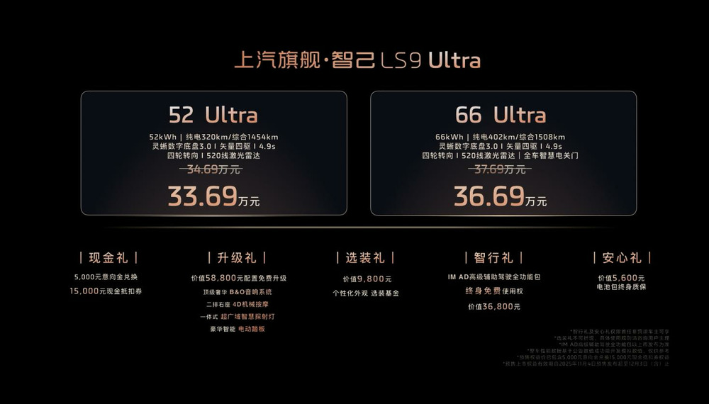 11月4日,上汽旗艦·智己LS9全球首發(fā)并正式開啟預(yù)售。新車重磅首發(fā)兩個(gè)超級(jí)增程版本,全系皆Ultra:52 Ultra版,預(yù)售權(quán)益價(jià)33.69萬(wàn)元;66 Ultra版,預(yù)售權(quán)益價(jià)36.69萬(wàn)元。作為匯聚上汽集團(tuán)70年造車底蘊(yùn),集全球頂尖技術(shù)打造的旗艦之作,智己LS9以“兩大跨代際硬核科技+兩大智能時(shí)代最強(qiáng)創(chuàng)新”的絕對(duì)實(shí)力,一舉顛覆30萬(wàn)級(jí)大六座SUV市場(chǎng)格局,正式宣告9系新王誕生!