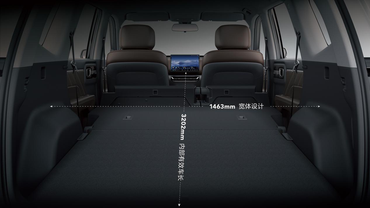 車內(nèi)空間布局尤為考究:內(nèi)部有效車長達(dá)3202mm,后排1463mm超寬體設(shè)計,確保三人同坐依然舒展;前后排座間距達(dá)990mm,身高1米8的乘
